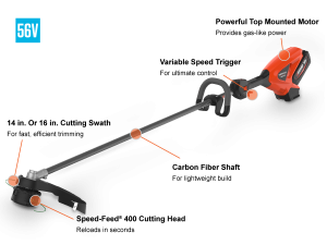 The DSRM-225 56V Battery-Powered String Trimmer provides gas-like power with precise control from its top-mounted motor. It includes the Speed-Feed® 400 Trimmer Head for easy line reloading, an integrated display for battery and power levels, and a durable carbon fiber shaft.